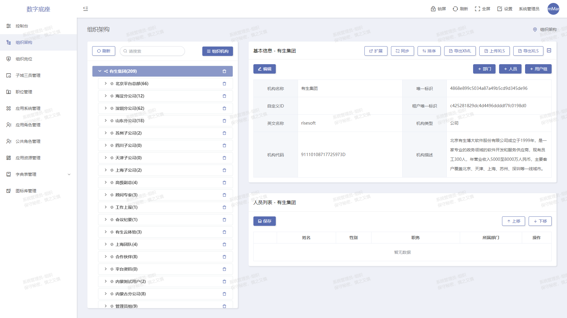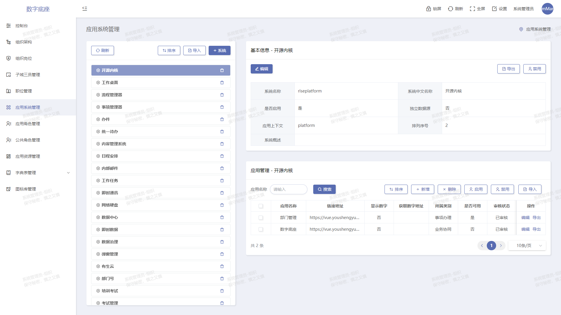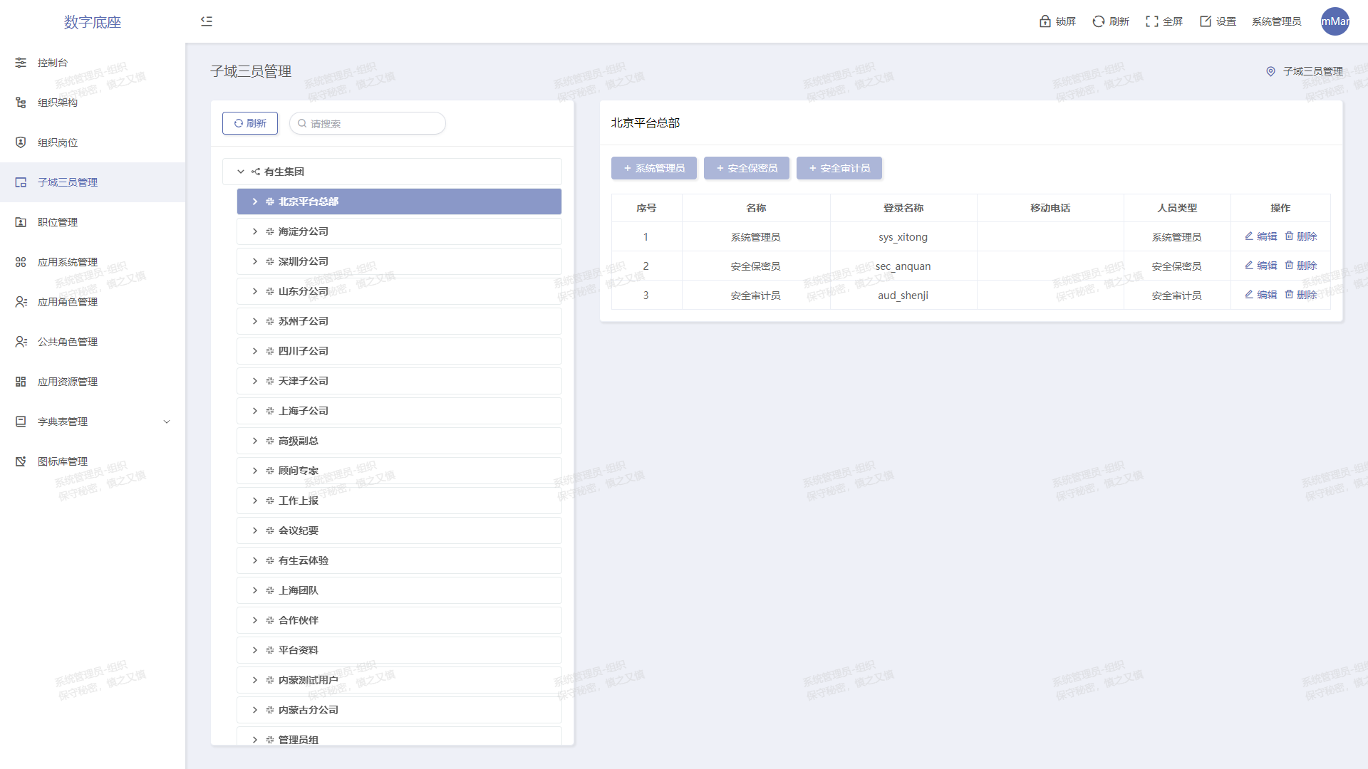 以組織結構和應用授權為主線,內(nèi)置三員管理、崗位制等功能